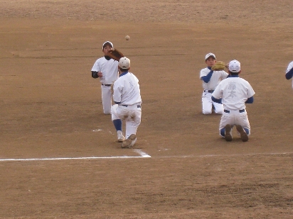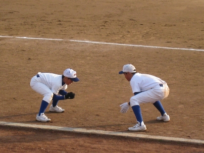ボールを転がし、グラブを使わずのとる練習ですが、そのとき身体は地面と平行になったままで、繰り返し、繰り返しボールのやりとりをします。非常に苦しい練習のようですが、この基本練習を通して正しい捕球姿勢を身につけることができます。奥村さんのお話によると、日本のプロ野球でも、アメリカのメジャーリーグでも、キャンプでは、このような基本練習が一番重視されているとのことです。