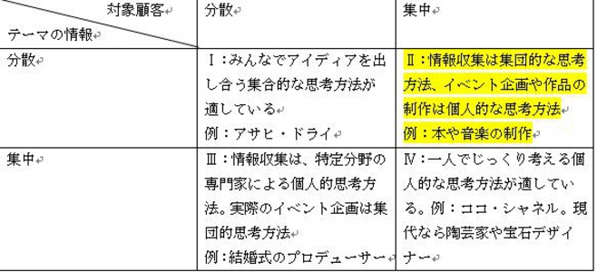 上記の表では、Ⅱが、音楽の制作の領域です。音楽のプロデューサーは、多様化した情報から、特定の音楽ファンにヒットする音楽を企画し、それに適したアーティストを選ばねばなりません。しかしこのような状況は、さまざまな商品分野でも現れています。