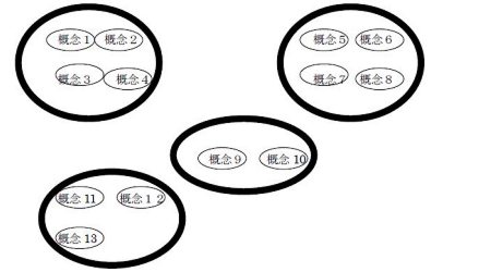 創造性があまりない人は、グループとグループの壁が厚く、ほかのグループにある概念と結び付けることができない人だと思われます。そのことを図に表わすと、次のようになります。